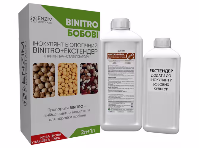 Інокулянт для гороху BiNitro© Горох - це двокомпонентний рідкий препарат (інокулянт + екстендер) для передпосівної інокуляції насіння гороху, бобів, сочевиці, вики на основі культури бульбочкових бактерій Rhizobium leguminosarum штаму RL 45 з титром не менше 1х1010 КУО/мл та продуктів їх метаболізму (фітогормони, амінокислоти, вітаміни).